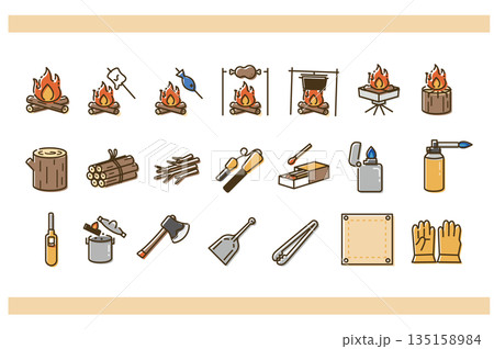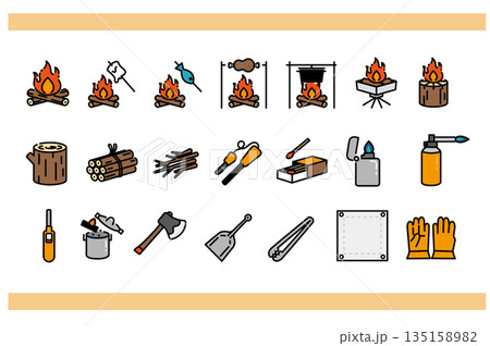 焚火と道具のシンプルなアイコンセット かわいいカラー