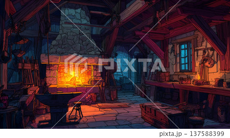ファンタジー鍛冶屋の工房内部|炎の炉と金床のある鍛冶作業場背景