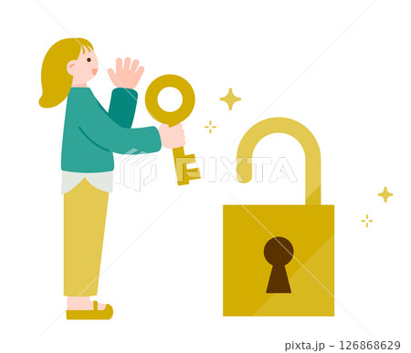 鍵で錠前を外す女性 問題解決や突破、開放感を象徴したイラスト