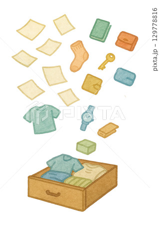 断捨離イラスト 引き出しから溢れる衣類や書類 整理整頓を表すシンプル素材