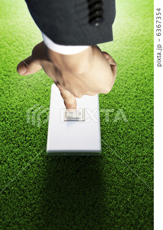 スイッチを押すビジネスマンの手と芝生