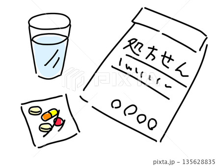 処方箋と錠剤とお水のグラスのイラスト