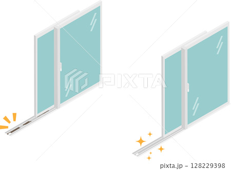 アイソメトリックな窓の桟にたまったゴミの掃除前と後のイメージ素材