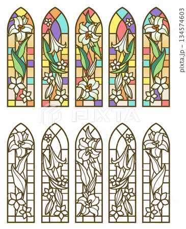 ステンドグラス風の百合の花 イラスト素材セット(カラー・線画)