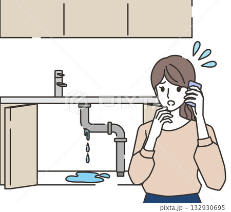 キッチンの水漏れで電話している女性のイラスト