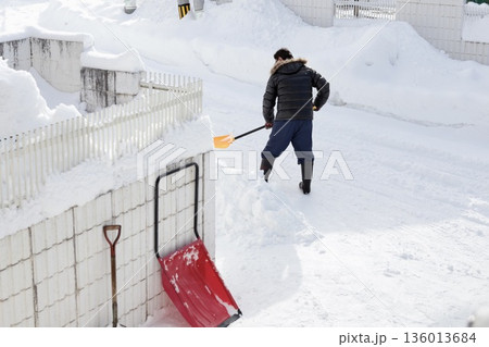 除雪スコップで雪かきをしているシニア男性の後ろ姿