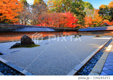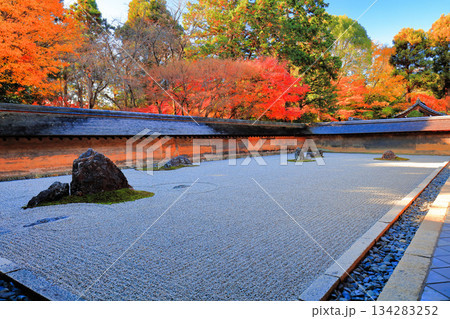 秋の日本の寺院 枯山水と紅葉の美しい風景