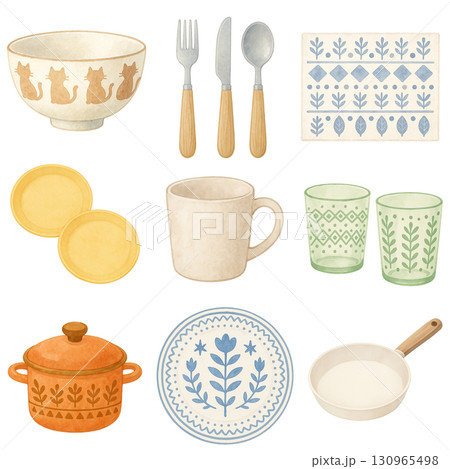 北欧風 食器 カトラリー 鍋 水彩イラスト 切り抜き 素材