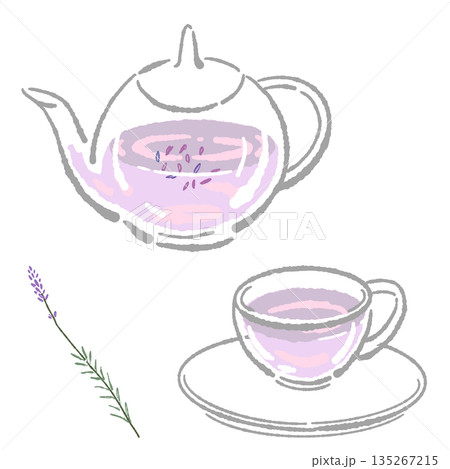 手書き風のガラスのハーブティーセットのイラスト(ラベンダー・ティーポット・カップ)