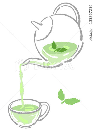 手書き風のガラスのハーブティーセットのイラスト(ミント・ティーポット・カップ)