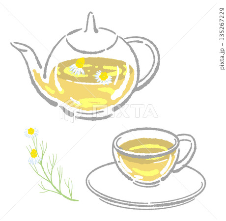 手書き風のガラスのハーブティーセットのイラスト(カモミール・ティーポット・カップ)