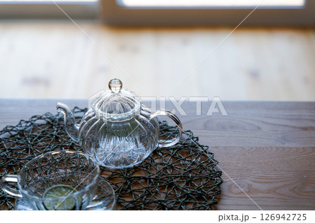 テーブルに置かれたガラスのティーセット