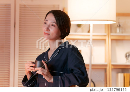 夜、部屋でホットドリンクを飲むパジャマの女性