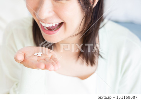 ベッドルームでホットドリンクを飲む女性(白湯,温活,コーヒー)