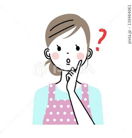 エプロンをした女性 人差し指を頬にあてて不思議そうな顔をしている女性