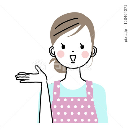 エプロンをした女性 笑顔でどうぞのポーズをしている女性