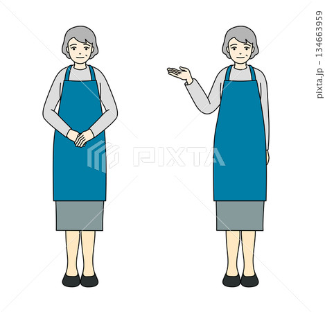 青いエプロンとズボン姿で笑顔で案内するシニア女性の全身イラスト