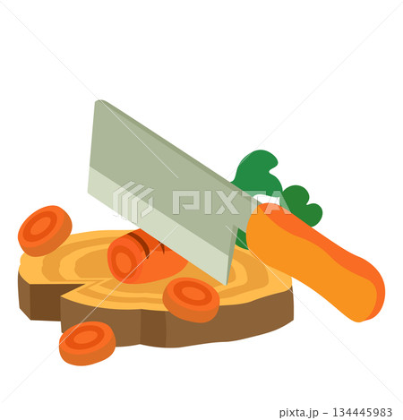 輪切りにした切り株のまな板の上で人参を包丁でカットするイラスト
