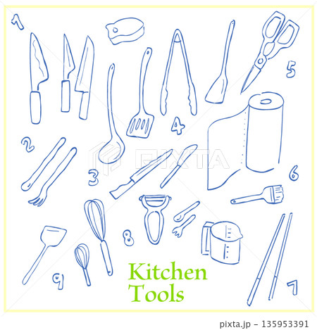 キッチン用品の線画 素材セット 調理器具 手描き風 アイコン