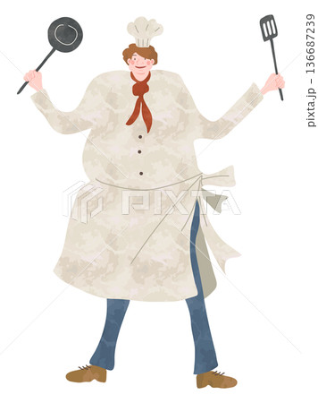 コックコートを着てフライパンとフライ返しを持つシェフのイラスト