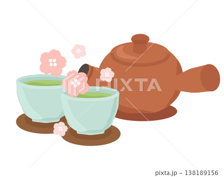お茶を注ぐ急須と湯呑みのカラーイラストセット