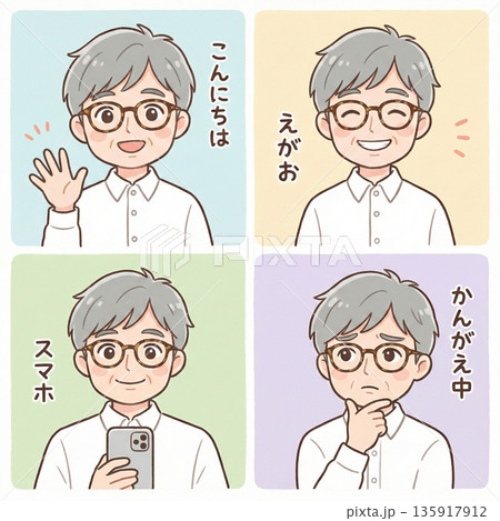 眼鏡をかけた笑顔のシニア男性のイラスト LINEスタンプ風