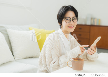 リビングでスマホを見る女性