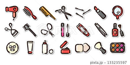 美容と化粧品の手描きイラストステッカーセット スキンケア、メイク道具のベクター素材