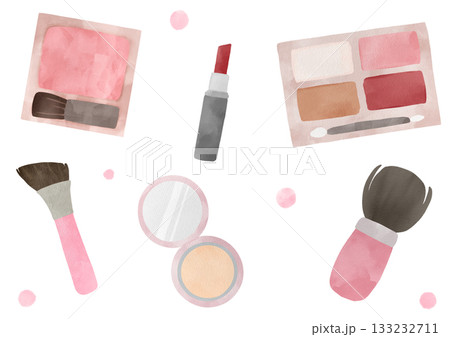 水彩タッチのメイクアップ道具セット ピンク系 暖色 可愛い