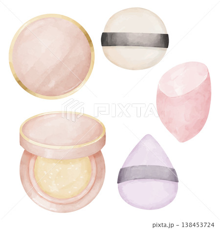 水彩画風の色々な種類のファンデーションのパフのイラスト