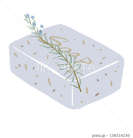 ローズマリーが乗ったシンプルな石鹸のイラスト 刻印入りの固形石鹸