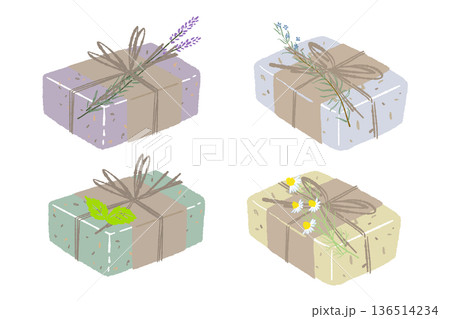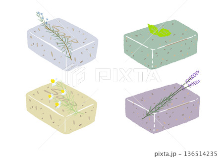 4種類のハーブ石鹸のバリエーションセットイラスト 色々なハーブソープ