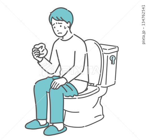 トイレで紙を見て出血や分泌物を確認する男性のイラスト(血便・尿漏れ・雫アイコン)