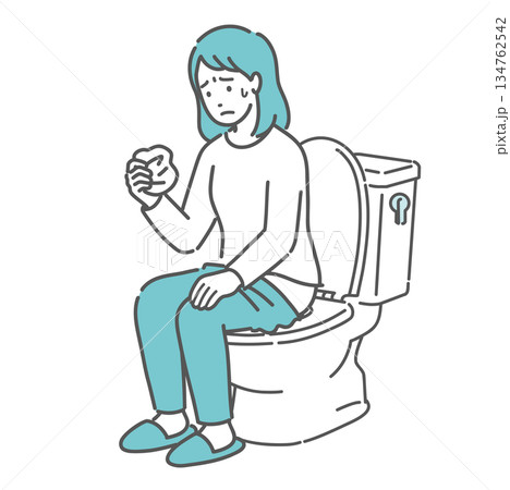 トイレで紙を見て生理やおりもの、血便を確認する女性のイラスト(不正出血・不安)
