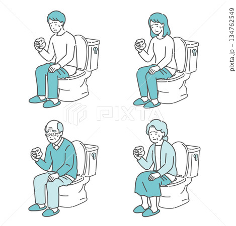 トイレで紙を見て健康チェックする男女・高齢者のイラストセット(血便・検診・早期発見)