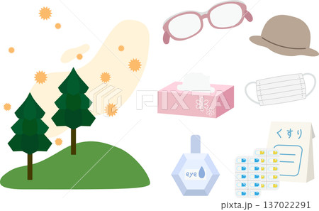 花粉症等のアレルギー症状に関する対策グッズのイラストセット
