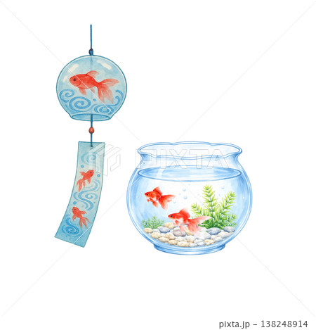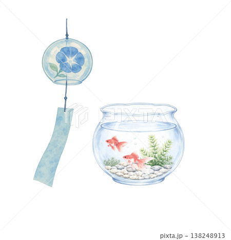 風鈴と金魚鉢のシンプル素材 夏の涼しげ和風イメージ 白背景