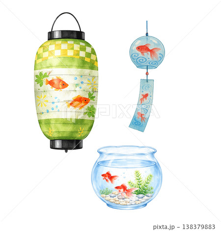 提灯と風鈴と金魚鉢 水彩イラスト 夏の和風あしらい素材 涼しげでかわいい手描き風デザイン