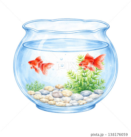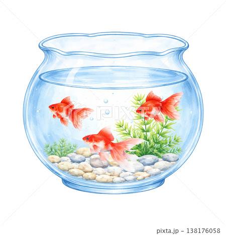 丸い金魚鉢の中を泳ぐ金魚の水彩画イラスト 生成AI