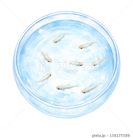 小魚のいる金魚鉢のシンプル素材 上から見たアクアリウムデザイン 白背景