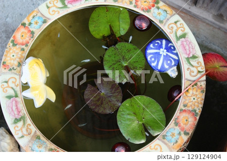睡蓮と水草のあるガラスのアクアリウム。真上からのアングル