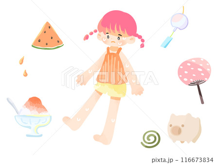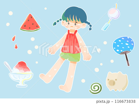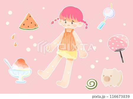 風鈴のそばでスイカをかじって眠っている黄鬼のイラスト