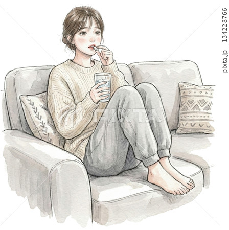 ソファで薬を飲む女性