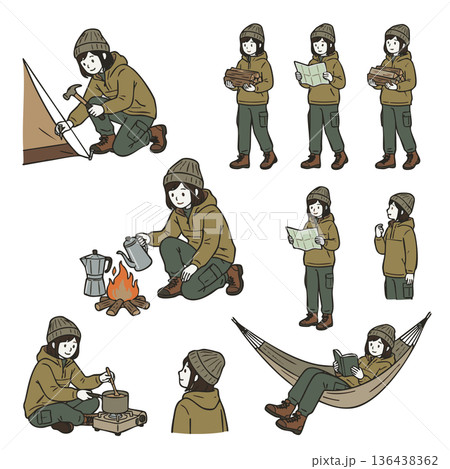 ソロキャンプを楽しむ女性のアウトドア動作イラストセット