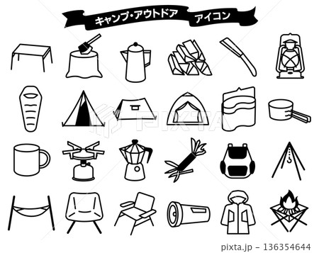 キャンプアイコン集 ガスランプ 焚火台薪飯盒テント寝袋ハンモック焚き火三脚クワトロポッド