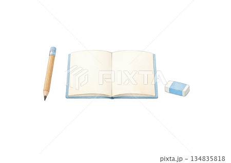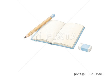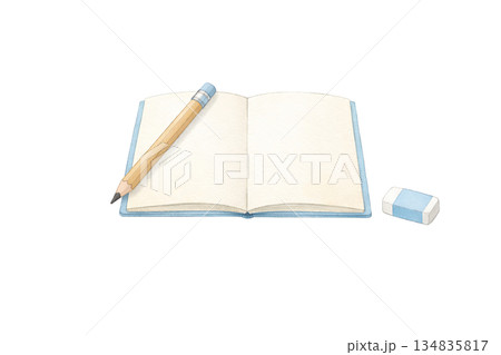 鉛筆と消しゴムが添えられたノートの水彩風イラスト素材