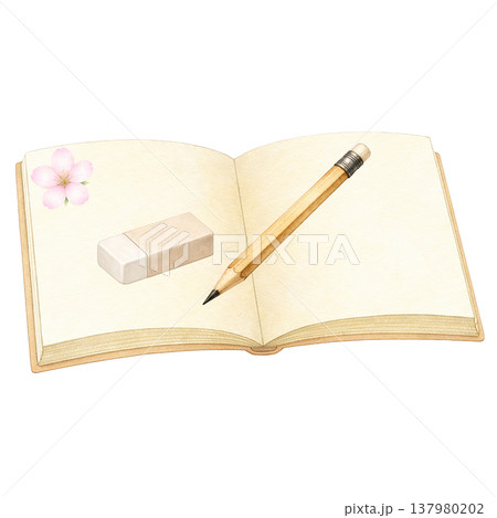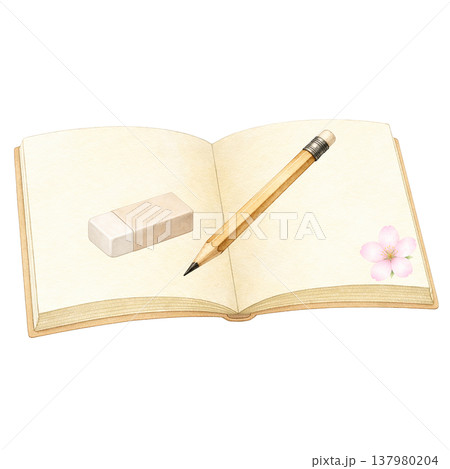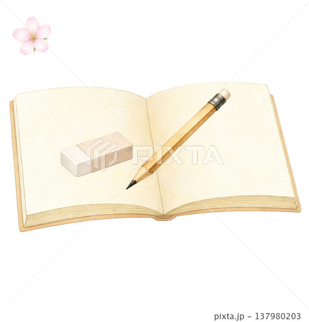 開いたノートと鉛筆と消しゴムと桜のシンプル素材 春の学習文房具 白背景 教育イメージ