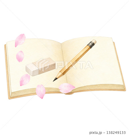 鉛筆と消しゴムが添えられたノートの水彩風イラスト素材