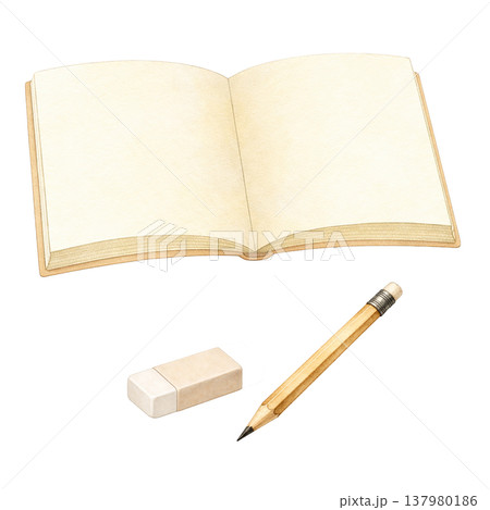 水彩風 ノートと鉛筆と消しゴムの学習イラスト