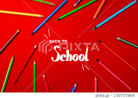 Colorful pencils surround the phrase back to school on a bright red background, capturing the excitement of a new academic year